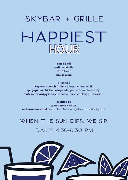 Come for the golden-hour glow, stay for the atmosphere that shifts effortlessly from lively to laid-back. Whether you’re in the mood to mingle or unwind, SkyBar + Grille offers a setting that moves at your pace—always with a view.